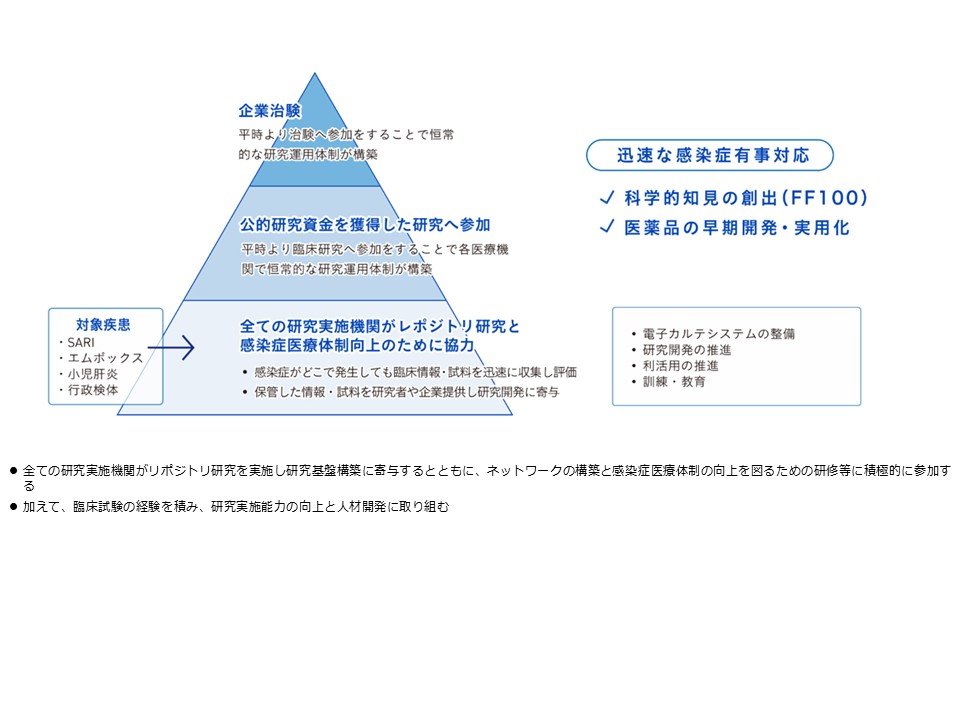 また、感染症臨床研究ネットワークを活用した多施設での迅速な医薬品等の臨床試験(治験)の立ち上げや、収集した試料・データを希望する製薬企業・研究者へ提供を行うことにより、国内における迅速な医薬品等の実用化につながることが期待されます。
