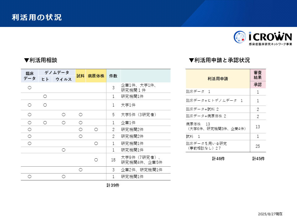 - 利活用の研究成果等を公表する際、iCROWNのリポジトリのデータを利用した旨を謝辞およびmethodsに記載していただきます。
